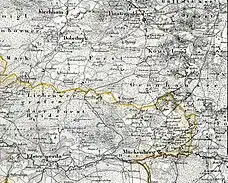 At the beginning of the 19th century, the Napoleonic Wars had a significant impact on Europe. The Kingdom of Saxony, which had aligned itself with Napoleon, ended up on the losing side. Following the Congress of Vienna in 1815, Saxony was divided, and it had to relinquish substantial portions of its territory. The new border traversed the region along the road from Mühlberg to Ortrand. Communities along this road were annexed to Prussia. To the north of Gröditz, the border intersected the course of the raft canal, splitting it into a Prussian section in the north and a slightly larger Saxon section in the south. This division also separated the ironworks in Gröditz from its parent facility in Mückenberg by a state border. Additionally, Saxony no longer had access to the forests situated north of the canal. During negotiations on behalf of the state, Detlev von Einsiedel, the state secretary, secured a written agreement for free navigation and rafting on the canal in the Vienna Peace Treaty.[5][17] However, especially in the smaller Prussian section, the transport route then largely lost its importance for the transport of goods. Furthermore, when Prussian State Highway No. 62 was established, crossing the canal and intended as a postal route from Berlin to Dresden, the canal was filled in at Holzhof in Elsterwerda without much ceremony. Consequently, timber transports on the canal came to a complete halt in 1833.[2][18]