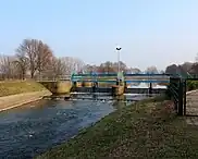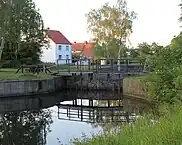 The differences in elevation between the Pulsnitz or the Schwarze Elster and the Elbe were initially overcome using three chamber sluices built in wooden construction, the Prösen sluice (2.80 m), the Gröditz sluice (2.25 m) and the Pulsen sluice (0.65 m) were constructed.[30][31] Due to ongoing issues at the Prösen sluice, it was rebuilt in stone in 1755 and further renewed in 1766/67. Additionally, a fourth sluice, the Elsterwerda sluice, was added in 1766. The chamber sluices had a usable length of 42.70 meters. They were 8.70 meters wide, and the sluice openings on both sides were 5.70 meters. Typically, it took around 12 minutes for a vessel to pass through one sluice.[2]