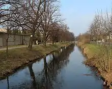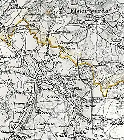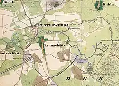 While the jubilee volume of the local history societies Elsterwerda and Gröditz published in 1997 was named "250 years of the raft canal Grödel-Elsterwerda", the water body was again named Floßkanal Elsterwerda - Grödel in 1912 in the Neues Archiv für sächsische Geschichte und Altertumskunde (New Archive for Saxon History and Antiquity), a professional journal for Saxon regional history.[4] In the map of the German Empire published in 1907 by Perthes in Gotha and in the Vienna Peace Treaty of 1815 (Article 17) the canal is called Elsterwerdaer-Floßgraben.[5] Alfred Hettner's Geographische Zeitschrift from 1898 calls it Grödel-Elsterwerdaer Floßkanal.[6] Under this name, it is also described in volume 63, "Der Schraden", of the publication series Werte der deutschen Heimat published in 2001. The Riesa River Master's Office still calls the canal by this name in the present day.[7] Meyers Konversations-Lexikon from 1885 and Petermanns Geographische Mitteilungen published in 1902 described it as Grödel-Elsterwerdaer Kanal.[8][9]