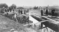Müller, who had previously overseen the construction of the main raft ditch, was assigned the responsibility for the canal's construction. The original completion date for the canal was scheduled for 1744. However, the project encountered numerous challenges.[2] Excavation work proved to be highly expensive, securing a reliable workforce was a persistent issue, and difficulties arose in establishing a connection to the Elbe and the Prösen sluice. The presence of unfavorable foundation soil, specifically alluvial sand, posed a significant challenge, leading to multiple renovations of the Prösen sluice. It was not until 1767 that this sluice functioned satisfactorily.[14] As a result, the direct connection to the Elbe was ultimately abandoned.[13]