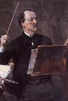 In April 1844, Verdi took on Muzio, eight years his junior, as a pupil and amanuensis. He had known him since about 1828 as a protégé of his own supporter, Antonio Barezzi.[2] Muzio, who in fact was Verdi's only pupil, became indispensable to the composer. He reported to Barezzi that Verdi "has a breadth of spirit, of generosity, a wisdom."[3] The relationship was to grow stronger, and Muzio remained a lifelong friend. In November 1846, Muzio wrote of Verdi: "If you could see us, I seem more like a friend, rather than his pupil. We are always together at dinner, in the cafes, when we play cards...; all in all, he doesn't go anywhere without me at his side; in the house we have a big table and we both write there together, and so I always have his advice."[4] Muzio was to remain associated with Verdi throughout his life, assisting in the preparation of scores and transcriptions, and later conducting the premieres of many of his works in their premiere performances in the USA and elsewhere. He was chosen by Verdi as one of the executors of his will, but predeceased the composer in 1890.[5]