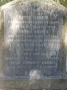 Harris was the second daughter of five children of Sarah Hill and her husband Edwin Harris.[3] The Harris family emigrated from England on the "William Bryan", a ship of the Plymouth Company of New Zealand. They reached New Zealand on 31 March 1841.[2] Harris' father was a civil engineer and surveyor as well as a competent artist who supported his daughters efforts in painting.[3] Her mother was a teacher who established a primary school in Taranaki. Harris subsequently became an assistant teacher at that school.[4]