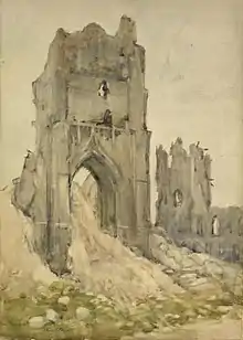 Emily studied at the Edinburgh College of Art as well as in Paris and lived at Albyn Place, Edinburgh before moving to London in 1917.[5] She travelled widely between 1909 and 1934. Shortly after the end of World War One, she visited the former battlefields at Ypres in Belgium. Her watercolours of ruined churches and other destroyed buildings from there, including views of the Ypres Cloth Hall, were shown in London in 1919. Paterson also visited the Netherlands and Italy on a number of occasions and was a keen Alpine walker, often making painting trips to both the Tyrol and Swiss Alps and exhibiting the resulting works at the Alpine Club in London.[6] Her favoured subjects were landscapes, architecture and botany. She was elected member of the Royal Scottish Watercolour Society, Scottish Artists' Society and the Society of Women Artists.