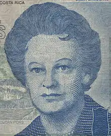 The Central Bank of Costa Rica decided to include her effigy on the ten thousand colones bill in 1998, being the first time in the history of the bank that a product gave recognition to women's contributions in the country's development. The design on the bill was made by a graphic arts student from the University of Costa Rica, Moral Frame Salazar.[3]