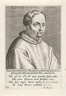 Between 1443 and 1446, Philip the Good commissioned him to write a chronicle on the history of the Duchy of Brabant until 1442: Chronica nobilissimorum ducum Lotharingiae et Brabantiae ac regnum Francorum.[1][2] It runs until 1442 and was translated into French by Jehan Wauquelin, Philip the Good's secretary.