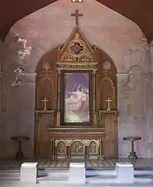 In 1900, after diplomatic relations between Díaz's Mexico and Austria-Hungary resumed, the chapel was constructed on the site. Commissioned by Emperor Franz Joseph I in memory of his late brother[2] and designed by architect Maximiliano Mitzel, the chapel was dedicated on 10 April 1901. It is designed in an eclectic Viennese style.[2] The altar and altarpiece were made at the Querétaro School of Arts and Crafts, and the cross on the altar is taken from the Austrian frigate SMS Novara, which had brought Maximilian and his wife Empress Carlota to Mexico, and which later transported Maximilian's remains back to Austria.[3] Maximilian is buried in the Imperial Crypt in Vienna.