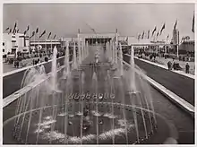 The British and the Dominion governments, Canada, Australia, New Zealand, South Africa, Burma and Ireland and the Colonial governments could appoint their own architect for their pavilions, assisted by the guidance of Tommy Tait. West Africa, Southern Rhodesia and East Africa had their pavilions and fifteen other Colonies[23] came together in a composite Colonial Pavilion. The largest national pavilion was the ultra-modern British Government Pavilion[24] designed by Herbert Rowse[25] of Liverpool. In addition to the main Industrial and Engineering Halls, Commonwealth pavilions and cultural exhibits there were no-less than sixty-two pavilions erected by famous commercial and industrial concerns.[26] The Empire Exhibition had the first-ever major dancing water fountains built, for its lakes and cascades. They were also floodlit and changed colours.[27][28]