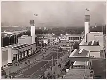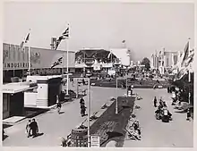 1938 Empire Exhibition view along Kingsway in Bellahouston Park, Glasgow, with the Palace of Industries on left and the United Kingdom Pavilion in middle distance.
