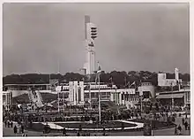 1938 Empire Exhibition view over the South Bandstand in Bellahouston Park, Glasgow, centre left the Garden Club, ICI Pavilion and others and Tait`s Tower overhead.