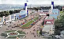 1938 Empire Exhibition view east over Scottish Avenue in Bellahouston Park, Glasgow, to the Scottish Pavilions and centre the Palace of Art, with Ibrox Park on distance left.