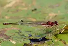 The scarlet bluet is a damselfly with a length of 29.5–30.5 mm (1.16–1.20 in) long. The male is predominantly red and black while the female is light green and black.[5]