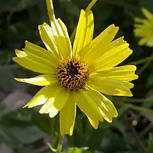 The solitary flower heads are daisy like, with 15 to 25 bright yellow ray florets 1 to 3 centimeters long around a center of protruding yellowish to purplish brown disc florets.