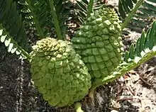 This plant is dioecious, meaning it has separate male and female cones. The male cones are green, 30–50 cm long and 7–10 cm wide, while the female cones are green, 35–45 cm long, 15–20 cm wide, and oval-shaped. The seeds are oblong, measuring 30–35 mm in length and 8–23 mm in width, covered in a brown sarcotesta.[3]