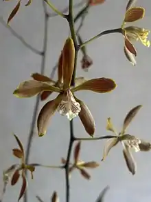 The flowers have sepals and petals that are yellow-brown to chocolate and a lip that is cream-colored with fine red-violet veins.[2][3] The flowers are displayed high above the leaves and have a mild fragrance.[4]