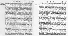 The first edition was reprinted in London, with slight variants on the title page and a different preface, by Edward and Charles Dilly in 1773 and by John Donaldson in 1775.[3] On the occasion of the 200th anniversary of the 1st edition, Encyclopædia Britannica Inc. published a facsimile of the 1st edition, even including "age spots" on the paper. This has been periodically reprinted and is still part of Britannica's product line.[7]