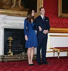 The engagement of Prince William and Middleton was announced in November 2010. On November 16, the couple posed for the press at St. James's Palace, where the piece was photographed.[10] The dress is a sapphire,[lower-alpha 1] tight fitting, long-sleeved, low-cut silk wrap dress with a gathered front, described as "one of Issa's classic silk jersey dresses".[11][13][14] The deep blue colour of the gown complemented the shade of the engagement ring, which had previously belonged to Diana, Princess of Wales.[11][12] Middleton paired the wrap dress with her engagement ring, a set of sapphire cabochon earrings and a necklace, and black pumps.[11][15]