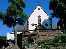 A burial chapel for the Catholic branch of House Löwenstein was built next to the church (the abbey had been their burial site since 1728). In 1899, the church was enlarged towards the west. A terrace was added as well as the room which today serves as a confessional chapel.[1][2]: 60