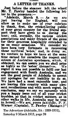 An English cricket team toured Australia in 1911–12. It was led by Plum Warner, but Johnny Douglas took over the captaincy for all five Test matches when Warner fell ill early in the tour. Despite losing the first Test at Sydney, a side which included Jack Hobbs, Frank Woolley, Sydney Barnes and Wilfred Rhodes hit back to win the remaining four Tests. They thus regained The Ashes.