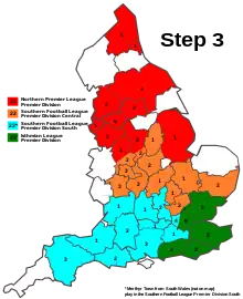 7. Northern Premier League Premier Division, Southern Football League Premier Central, Southern Football League Premier South and Isthmian League Premier Division (level 7, 22 teams each, leagues running in parallel): The champions in each division are automatically promoted; next four teams in each division compete in play-offs, with the play-off winners also promoted. The bottom four teams in each division relegated to a level 8 division as appropriate. If, after promotion and relegation, the number of teams in the divisions is not equal, one or more teams are transferred among the four divisions to even them up again.