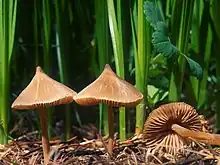 The cap is tan or orangish and ranges from 2–6 cm in diameter.[5] The gills are white.[4] The stalks are pale yellow,[4] measuring 3–7 cm tall and 3–4 mm wide.[5] The spores are brownish pink.[5]