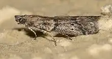 The wingspan is 12–16 mm. Adults are light grayish-tan with irregular bands of brown scales across the middle of the forewings and near the apex.