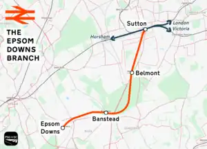 The Epsom Downs Branch is a railway line in the United Kingdom. The line runs from Sutton to Epsom Downs and is about 3+3⁄4 miles (6.0 km) long. The line starts at Sutton in the London Borough of Sutton. It is double track for about 3⁄4 mile (1.2 km) until it reaches the approach to Belmont where it becomes single track. The line continues from Belmont through Banstead and terminates at Epsom Downs in Surrey. The "Downs" referred to in the name are part of the North Downs.