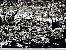 Lim Yew Kuan's After the Fire (Bukit Ho Swee) (1966) depicts the aftermath of a fire, a common occurrence in Singapore estates such as Tiong Bahru and Havelock Road, with one of the most serious being the Bukit Ho Swee Fire of 1961.[4]
