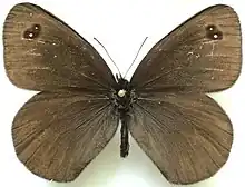 E. tristis Brem. (= wanga Brem.) (35c). Very similar to the preceding E. cyclopius, with which it agrees in size, shape and ground-colour. The yellow border of the double ocellus is narrower and somewhat dull in the male, and broader and light yellow in the female. The border of the ocellus is yellow on the underside of both sexes, being broader than above. The hindwing beneath is thinly dusted with whitish in the male and bears a small white spot at the apex of the cell. In the female the underside of the hindwing is more densely dusted with whitish, the dark dentate median band therefore being more prominent than in the male, in which sex it contrasts but little with the ground. Before the distal margin there is an arched, narrow, dark dentate line, proximally to which there is a small white dot each in cellules 2 and 4. The antenna thinly ringed black and white, club above black, the tip and underside russet -yellow. The specimens from Blagovestshensk larger than those from Raddefka.[2]
