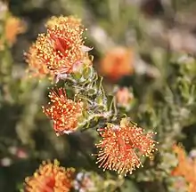 The flowers are orange-coloured and arranged in groups of up to six on the ends of the branches of the previous year's growth. There are 5 sepals and 5 petals 3.5–5.7 millimetres (0.1–0.2 in) long. The stamens, which give the flower its colour, are arranged in 5 bundles, each containing 34 to 48 stamens. Flowering occurs from September to December and is followed by fruits which are woody capsules. The capsules are more or less barrel-shaped, smooth and 8–11 millimetres (0.3–0.4 in) long and 2.8–6.1 millimetres (0.1–0.2 in) wide.[2]