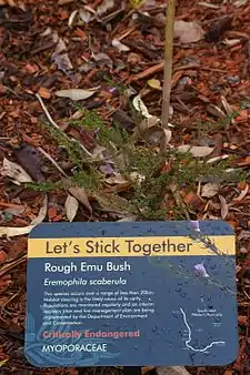 - 1 2 Stack, Gillian; English, Val. "Rough emu bush (Eremophila scaberula) interim recovery plan" (PDF). Government of Western Australia, Department of Conservation and Land Management. Retrieved 12 March 2016.