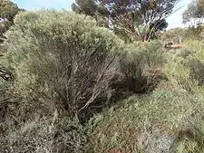 Silver emu bush occurs in Western Australia, South Australia, Victoria and New South Wales. In Western Australia it is found between Merredin and Echuca[3] in the Avon Wheatbelt, Coolgardie, Great Victoria Desert, Hampton, Mallee, Murchison and Nullarbor biogeographic regions.[11] In South Australia it occurs in the North-Western, Lake Eyre, Nullarbor, Gairdner-Torrens, Flinders Ranges, Eastern, Eyre Peninsula, Northern Lofty and Murray botanical regions.[4] It is found in the north-western corner of Victoria[2] and in New South Wales south from Wilcannia.[5] It grows on a wide range of soils, is common in mulga, mallee and chenopod communities[2] and is often the dominant shrub.[12]
