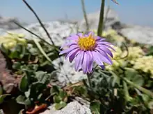 Erigeron asperugineus is a small perennial herb up to 20 cm (8 inches) tall, the stems mostly leafless and often lying flat.[3] The basal leaves have short hair with meandering margins and are wider towards the tip.[3] One plant usually produces 1 or 2 flower heads, each with 10–25 blue, pink, or purple ray florets about 1 centimetre (1⁄2 in) in length and surrounding many yellow disc florets.[4][3]