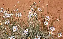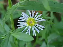 This plant is highly variable in form. It is an annual or perennial herb growing from a taproot and sometimes a caudex. It produces one to many stems 7 to 70 centimeters (3 to 27+12 inches) tall. It is a hairy plant, and the hairs are usually glandular, at least near the top of the stem. The basal leaves are 1 to 7 cm (12 to 3 in) long, and leaves higher on the stem are smaller. Flowering from April to September, the inflorescence can hold over 100 flower heads, each about 2.5 cm (1 in) wide.[3] The heads have 75 to 150 ray florets not more than 1 cm long which are white in color, fading purple, and sometimes absent. There are many yellow disc florets at the center. The fruit is seed-like and about 1 millimeter (116 in) long with bristles on the tip.[4][3]