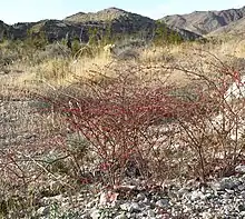 Eriogonum deflexum is a species of wild buckwheat known by the common names flatcrown buckwheat, flat-top buckwheat, and skeletonweed. This plant is native to the southwestern United States and northwestern Mexico, where it is common and grows in a variety of habitats, especially desert scrub. It is somewhat weedy where it is most abundant. This is an annual which varies in size from small patches on the ground to tangled bushes approaching two meters in height; it may be dense or thin and spindly. This is a brown or greenish weedy-looking herb with a many-branched stem. The leaves are located at the base of the plant and are rounded and woolly and one to four centimeters long. Small clusters of flowers appear at intervals along the branches with each flower only one to three millimeters wide and white or pinkish in color.
