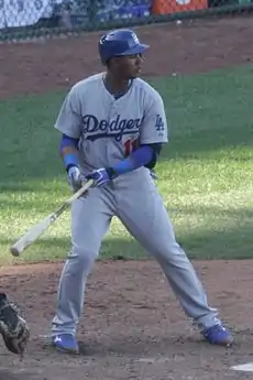 On February 12, 2014, it was reported that Arruebarrena had reached a preliminary agreement on a contract with the Los Angeles Dodgers.[6] On February 22, 2014, the Dodgers announced that they had signed him to a 5-year contract worth a reported $25 million, with a $7.5 million signing bonus.[7][8][9] He was assigned to the AA Chattanooga Lookouts to start his career and was called up to the Dodgers on May 21, 2014.[10] He made his MLB debut as the starting shortstop for the Dodgers on May 23, 2014.[11] He struck out three times in that game.[12] He recorded his first hit the next day, on a single to center field off of David Buchanan of the Philadelphia Phillies.[13]