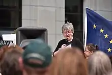 Ernestine Hayes speaking in front of the Alaska State Capitol in July 2019