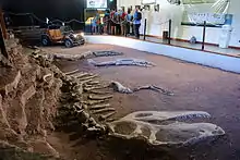 The Museum was inaugurated on 10 July 1997, and since 16 May 1999 it bears the name of Ernesto Bachmann,[3] who was an enthusiast of paleontology. The creation of the MEB was triggered by the finding of Giganotosaurus Carolinii,[4][5] one of the world's largest carnivorous dinosaurs, found in July 1993 by Rubén Darío Carolini[6]18 kilometres (11 mi) to the southwest of Villa El Chocón.