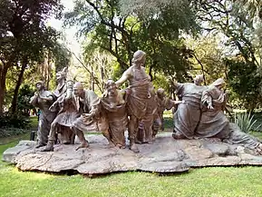 At the 1900 Paris exposition, Biondi also displayed his Saturnalia, which depicted 10 life-size figures. Each figure represented a different social class in Rome, from the gladiators and slaves to the patricians. All of the figures had an air of decadence.[2] Many critics did not like the work. Lorado Taft, the preeminent American sculpture critic of his day, said the sculpture "epitomized cruelly. but not unjustly, the trend of contemporary sculpture in Italy, with all its misplaced effort and its incredible, if not to say fiendish, dexterity."[5] However, Zimmern commented that "objections may be raised to it on the score of technique, but its cleverness is indisputable. ... The central idea inculcates that in the midst of revelry the great summons may come."[4]