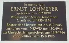 Lohmeyer opposed the Nazis and all related fascist impulses within the German church and society from their onset in the early 1930s.[1] He demonstrated his friendship and solidarity with Jewish professors Martin Buber and Jonas Cohn, in an era of strong antisemitism. Lohmeyer wrote to Martin Buber in 1933 that "the Christian faith is only Christian as long as it retains in its heart the Jewish faith".[n 1] In this period, his Evangelical Church of the old-Prussian Union, like other Protestant churches, was very quiet on the Jewish question. Gerhard Kittel even attacked Buber. On October 15, 1935, he was demoted from a professorship in prestigious Breslau to the relative backwater of Greifswald for his opposition to the Nazis.