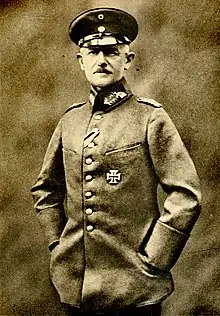 Hoeppner reorganized the fragmented air services, greatly increasing the number of Jastas (squadrons) and forming them into Jagdgeschwader (wings).[7] Priority was given to the development of strategies for massed air attacks.[8] In 1917 Hoeppner authored a memorandum asking for a significant increase in aircraft production which initiated the Amerika Programme. In 1917 he was awarded the Pour le Mérite even though as a senior commander he was not directly involved in air combat. The award was resented by some of his junior officers.[9]