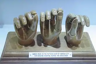 There was a huge influx of injured military personnel returning from the First World War with missing limbs due to the fighting. Britain at this time was wholly dependent on foreign imports of artificial limbs. Sir William Macewen, the chief surgeon at the hospital, thought that this was intolerable. A dispensary and operating theatre were fitted out as workshops making artificial limbs. Macewen also enlisted the help of a local shipbuilding company called Yarrow Shipbuilders. The company not only lent their yard but chose to have some of their best craftsmen working on the design and construction of the limbs. McEwan and Yarrows subsequently designed a new concept artificial limb known as the Erskine Artificial Limb. By December 1917 the hospital had treated 1,613 patients and of that number 1,126 required a new limb. And by 1920, there had been 9,500 artificial limbs fitted. Most of these were manufactured at the hospital’s workshops.[4][5]
