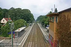 The two platforms are connected by a pedestrian overpass to the station building, which was built postwar and is located to the east of the tracks. Heading towards the south, the line runs through the 248 metre-long,[6] single-track tunnel under Stadtwaldplatz.