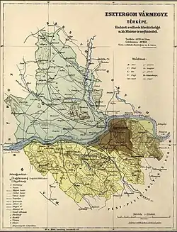 Esztergom County shared borders with the counties Bars, Hont, Pest-Pilis-Solt-Kiskun and Komárom. Its territory comprised a 15 km strip to the west of the lower part of the Garam river and continued some 10 km south of the Danube river. Its area was 1076 km² around 1910.