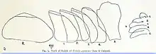 Radula: The teeth, especially those of the central part are very thin and transparent, without distinct cusps; the rhachidian tooth (R) is broadly winged, bow-shaped, at its upper part it is thickened, a true cusp cannot be detected. The first (i), second (2), third (3) and fourth (4) laterals are about equal in shape. The first one is subtriangular, with a slightly concave inner and convex outer margin, thickened at its upper part, the second is very similar, the third is narrower and the fourth is more subquadrangularly elongate; the fifth (5) or last lateral is club-shaped, thickened above, without cusp. Of the uncini (U) the proximal one has a short, broad cusp, with a small denticle near the base of the distal margin; the second is more elongate, also with a small denticle; the subsequent ones are much more elongate, No denticles can be detected, perhaps because the cusps lie so close together, as to cover each other in part.[6]