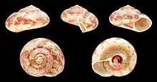 The length of the shell varies between 10 mm and 25 mm. The depressed, polished shell is perforate, solid, strong, and smooth. Its color is whitish, mottled and lineolate above with brown, reddish, fawn-color or purplish, with 4 narrow spiral articulated lines, sometimes scarcely visible because of the variegated coloration. The color of the base is lighter. There are six whorls, convex, the last one rounded and convex beneath. The suture is impressed. The aperture is oblique. The outer wall is moderately thick. The columella is strong and thick, arcuate above, spread upon the body whorl and nearly over the umbilicus in a pad of callus, which is either white, pink or deep crimson. The callus is kidney-shaped, but slightly convex, filling the umbilicus except a narrow chink. From the outer termination of the callus an arcuate groove extends to the base of the columella, within which the surface of the shell is radiately finely striate and darker colored.[5]