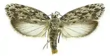 The length of the forewings is 11.9–13.4 mm (0.47–0.53 in). The ground color of the forewings is whitish, more or less uniformly covered by irregular, mostly ill-defined, dark brownish gray longitudinal streaks and spots. The ground color of the hindwings is semi-translucent whitish basally, becoming dark brown at the apical area and along the dorsal margin.[2]