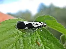 The wingspan of the moth ranges from 15–19 mm (0.59–0.75 in).[5] The basic color of wings is white, with large black markings.