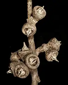 It blooms between June and December producing inflorescences with yellow-white-cream flowers.[2] Each simple, axillary conflorescence is composed of three to seven flowered umbellasters on narrowly flattened or angular peduncles. The cylindrical or conical or rostrate buds have a calyx calyptrate that sheds early. Fruits that form later have a hemispherical shape with a flat disc flat and exserted valves[7] with a width of 0.8 to 1.2 centimetres (0.31 to 0.47 in).[5]