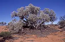 Eucalyptus canescens, commonly known as the Ooldea Range mallee or Beadell's mallee, depending on subspecies,[3] is a species of mallee that is endemic to southern Australia. It has rough bark from the base of the trunk to the thicker branches, smooth bark on the thin branches, egg-shaped to lance-shaped adult leaves, flower buds in groups of between seven and eleven, creamy white flowers and smooth cup-shaped to conical, and sometimes ribbed fruit.