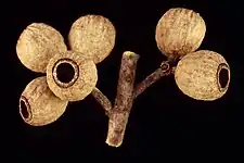 The flower buds are arranged in leaf axils in groups of eleven on an unbranched peduncle 8–15 mm (0.31–0.59 in) long, the individual buds on pedicels 3–7 mm (0.12–0.28 in) long. Mature buds are oval to pear-shaped, 6–8 mm (0.24–0.31 in) long and 4–5 mm (0.16–0.20 in) wide with a rounded, sometimes pointed operculum. Flowering occurs between August and October and the flowers are white. The fruit is a woody barrel-shaped to shortened spherical capsule 8–15 mm (0.31–0.59 in) long and 9–13 mm (0.35–0.51 in) wide with the valves enclosed below the level of the rim. The seeds are blackish brown, obliquely pyramidal and 3–5 mm (0.12–0.20 in) long.[2][3][4][5]